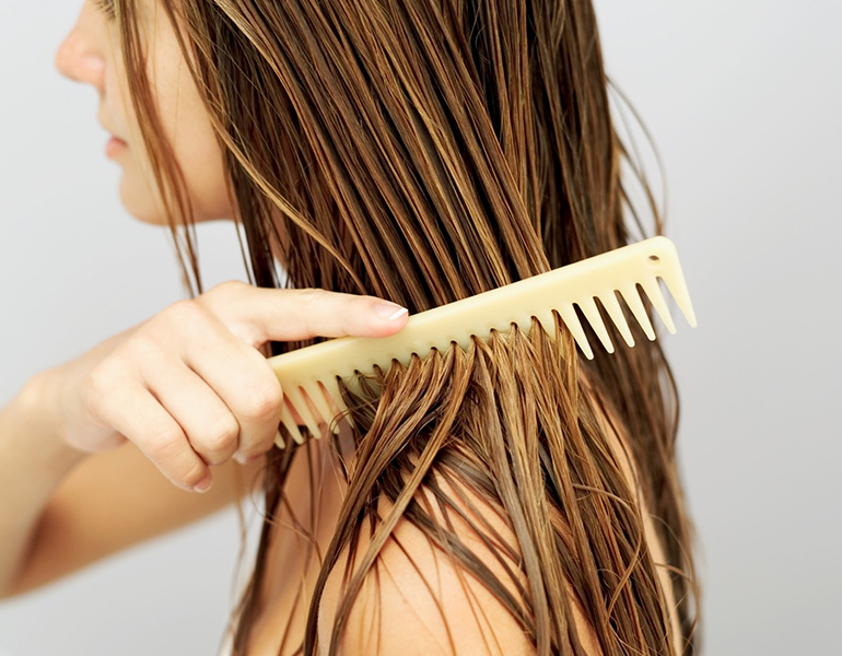 – Chải khi tóc khô khoảng 70%, bằng lược răng thưa